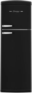 Timeless style meets efficiency in our 11 cu. ft. retro top-mount, Energy Star, frost-free refrigerator. Featuring chrome accents, LED display, adjustable glass shelves, frost-free cooling and Super Freeze Mode, it blends style with performance. Stay organized with a wine rack, ice tray, and humidity control crisper while the digital control panel and door alarm ensure convenience and peace of mind.Read More